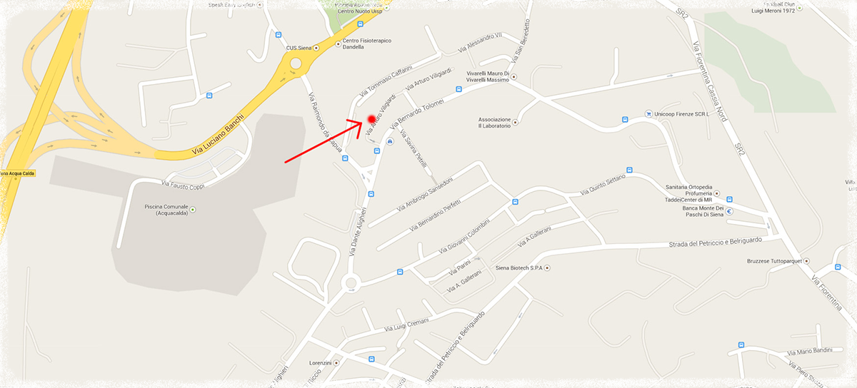 La nostra sede si trova in Via Arturo Viligiardi n° 22 a Siena, una strada secondaria che ha origine in via Bernardo Tolomei. Per maggiori informazioni si prega di selezionare le immagini sottostanti che forniranno un dettaglio sulla nostra posizione.